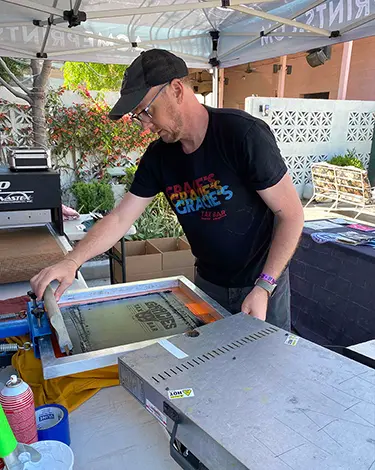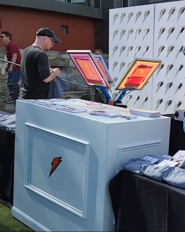 P.S.- Our CEO officiates wedding for funsies. Ask!Balloons & magicians are fun, but let’s think outside the box. Instead of a show they watch behind their phones – give your guests not only an experience, but also a physical keepsake from the event. People are always fascinated watching live serigraphy (the fancy way to say screen printing)!